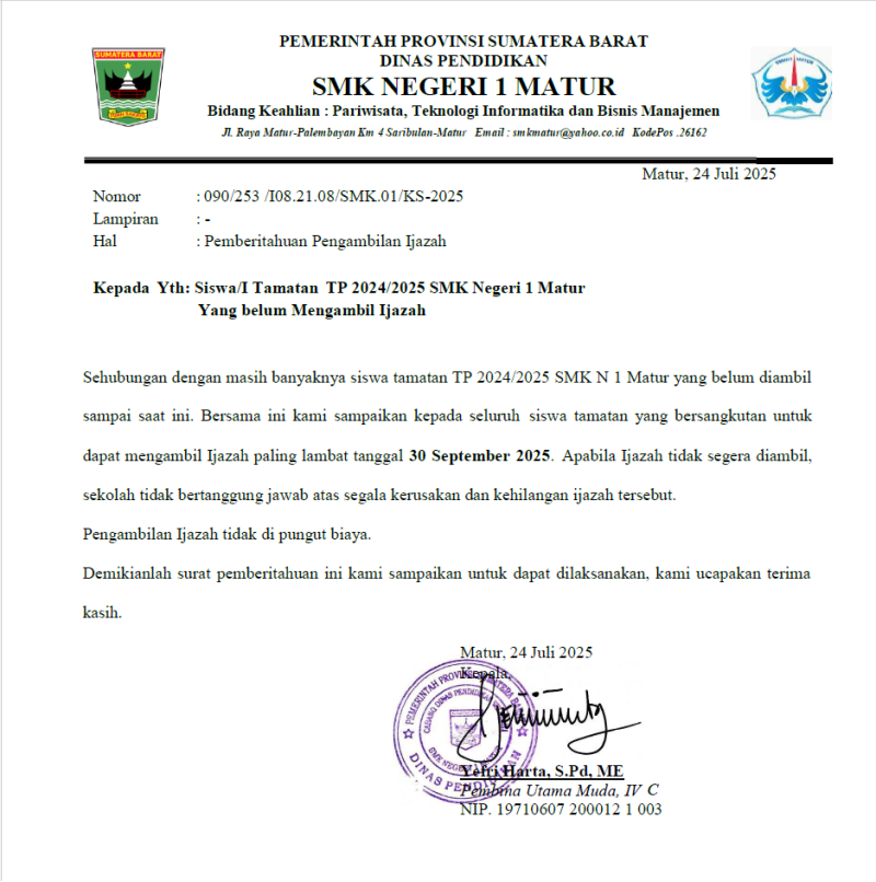 Sehubungan dengan masih banyaknya siswa tamatan TP 2024/2025 SMK N 1 Matur yang belum diambil sampai saat ini. Bersama ini kami sampaikan kepada seluruh siswa tamatan yang bersangkutan untuk dapat mengambil Ijazah paling lambat tanggal 30 September 2025. Apabila Ijazah tidak segera diambil, sekolah tidak bertanggung jawab atas segala kerusakan dan kehilangan ijazah tersebut.